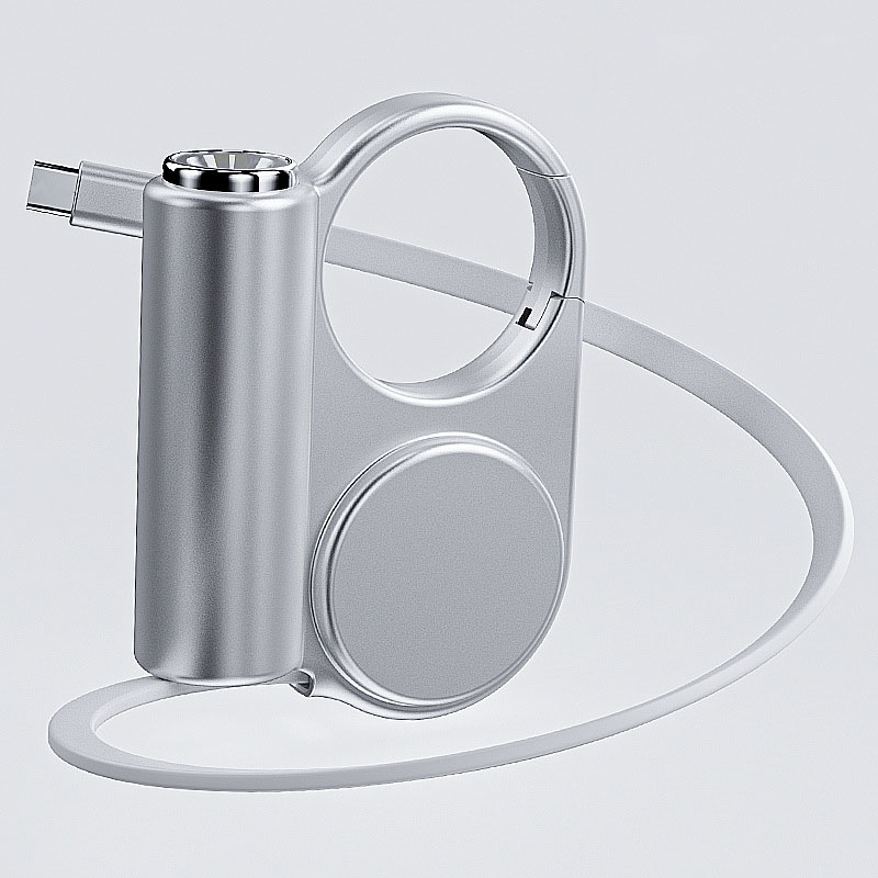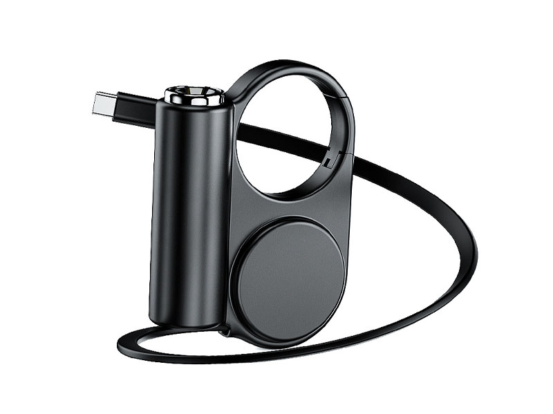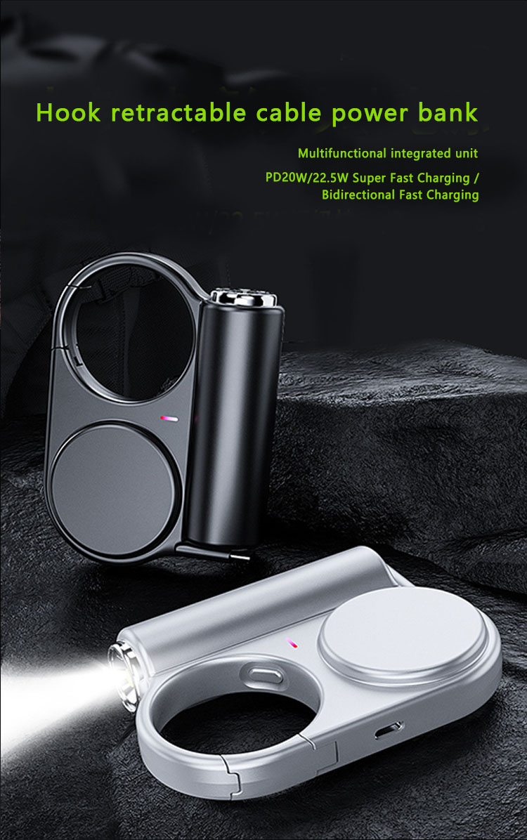 Portable power bank with 5000mAh capacity, equipped with retractable cable